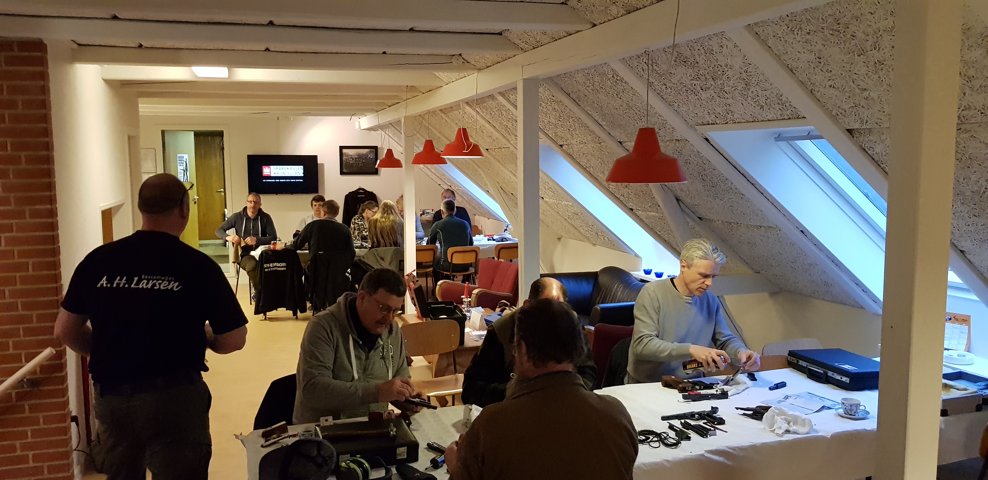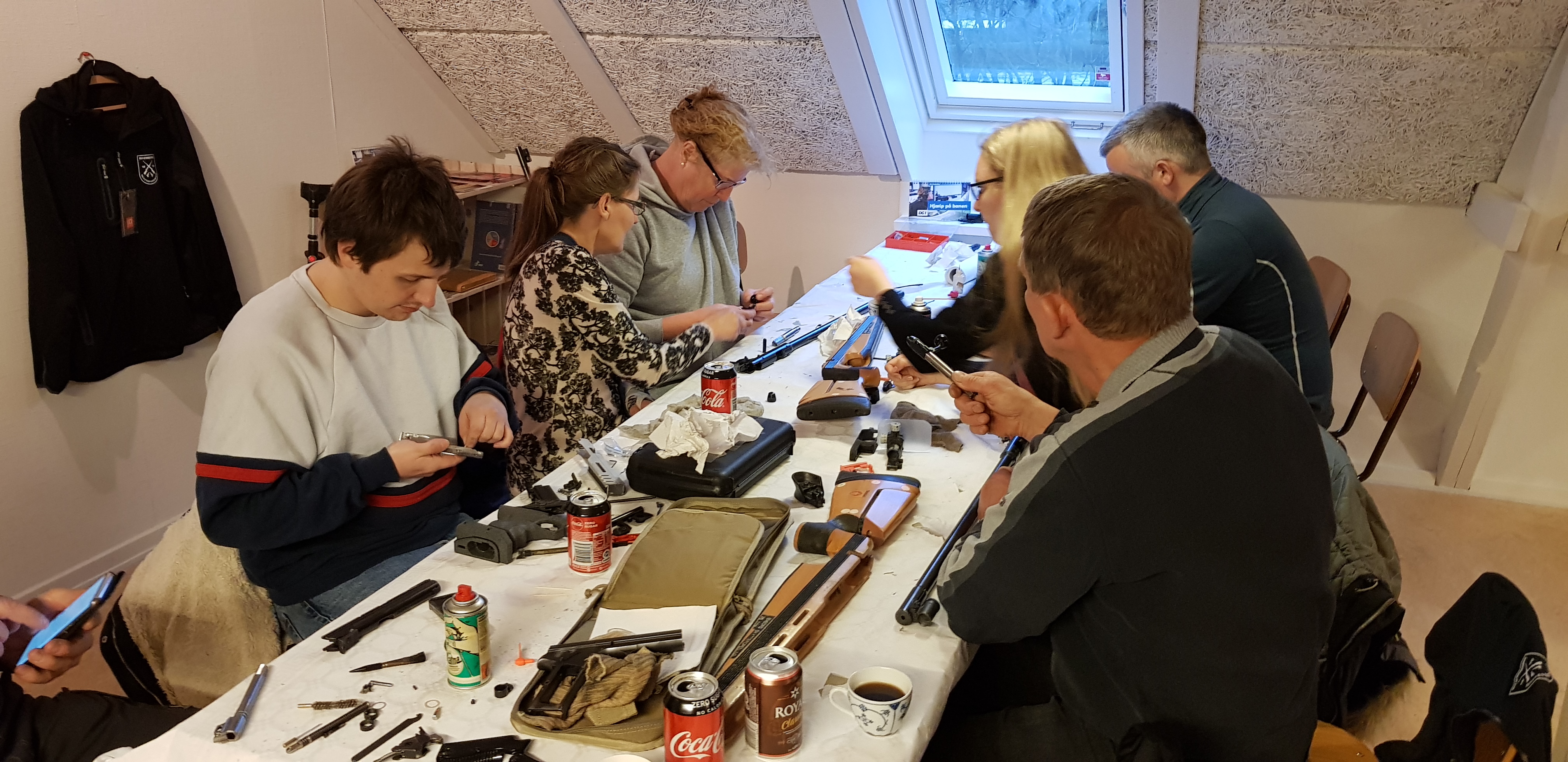 Der lå værktøj, skruer og stumper over det hele på bordene i skøn forening med kaffekopper og blødt brød og heldigvis var der kun blødt brød til overs, da alle våben var blevet samlet igen.